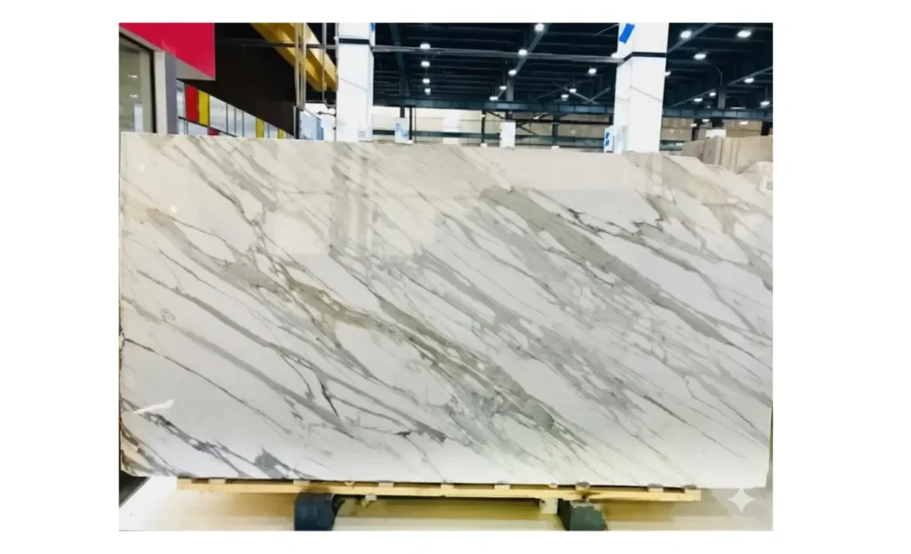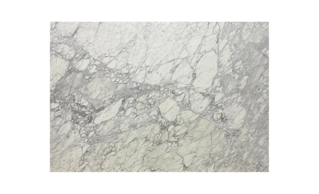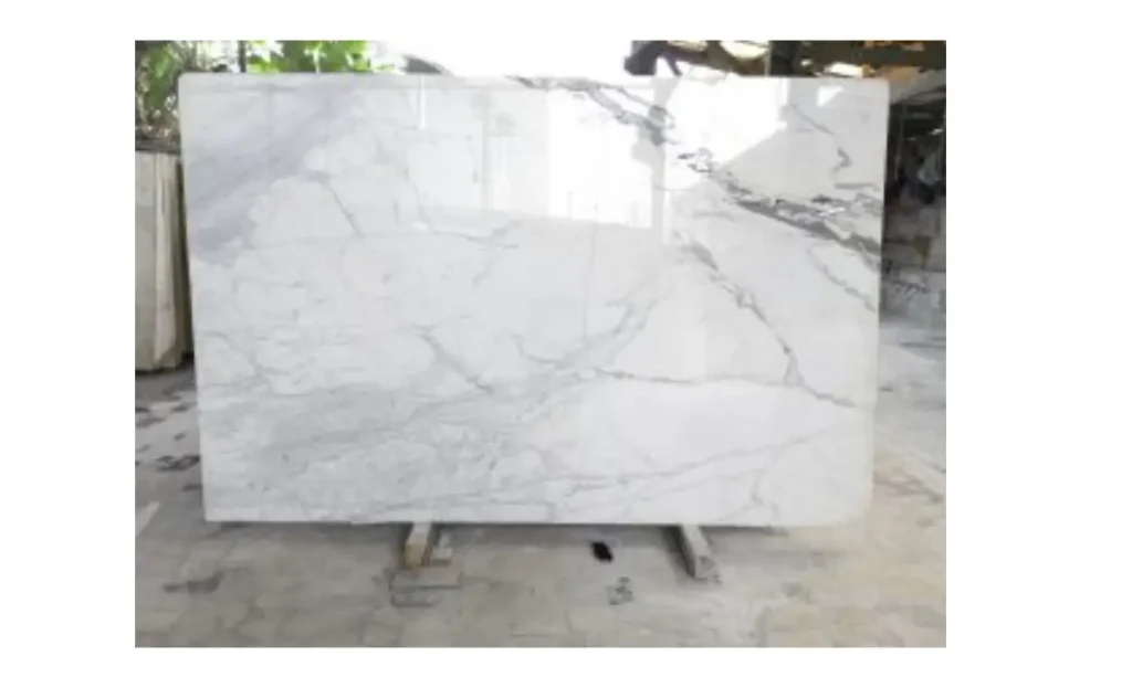 Marmer putih dengan pola urat abu-abu natural yang elegan dan modern. Ideal untuk dinding aksen, meja, dan tangga interior.